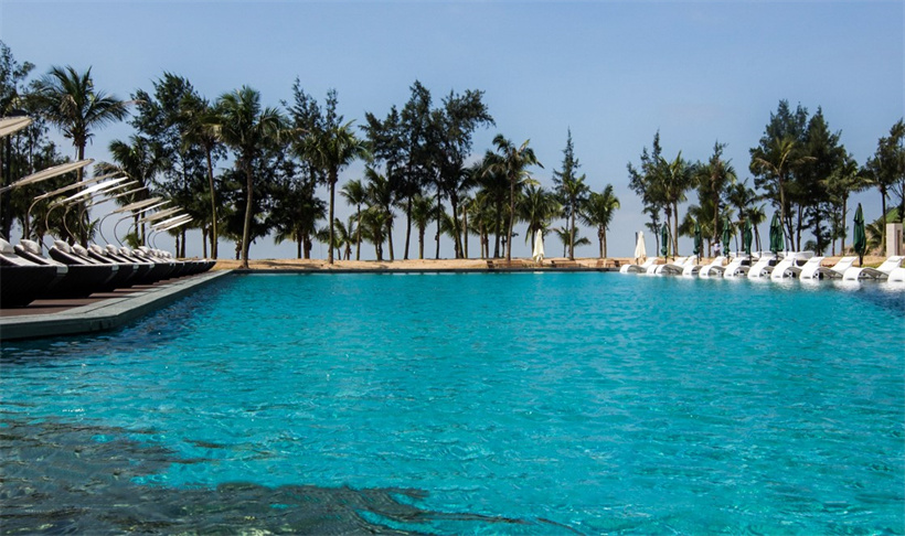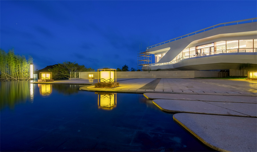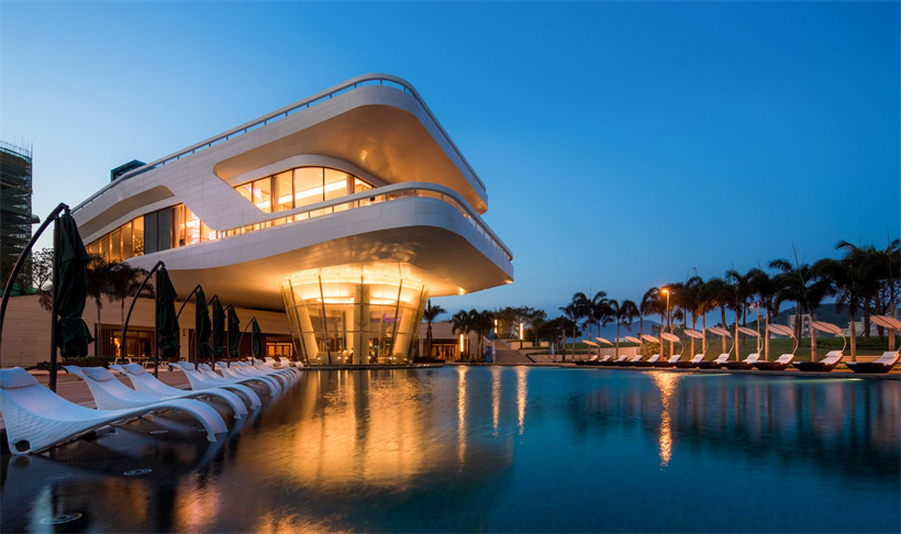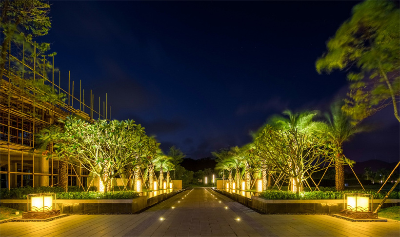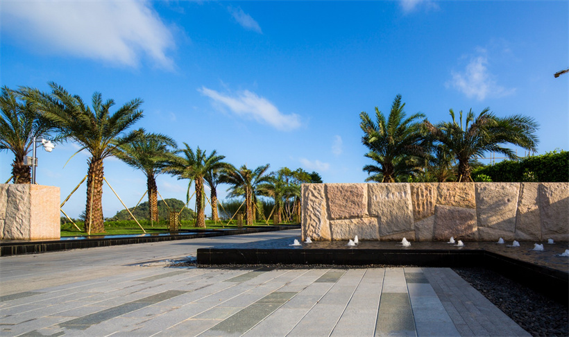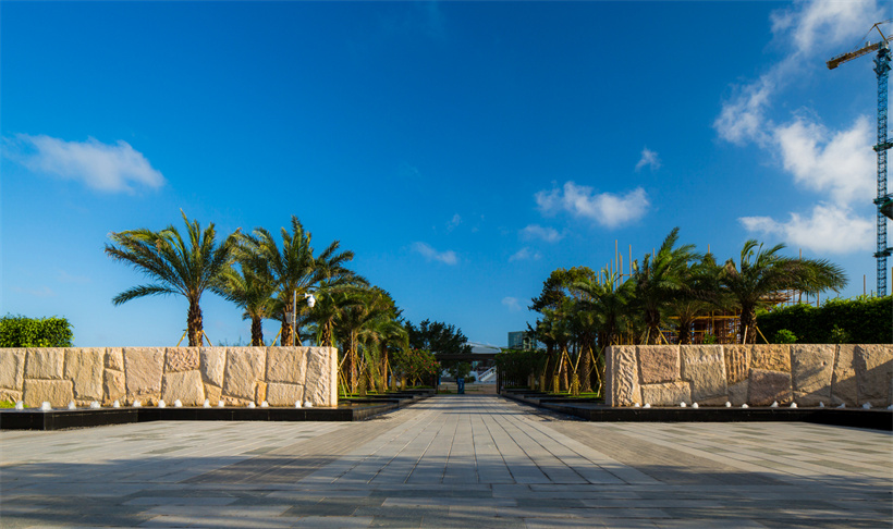 保利順峰·北洛秘境是保利集團與順峰集團合作的高端旅游度假項目。大塊異形自然面石材鋪貼的入口景墻、跌級水景及列植銀海棗,儀式感頓生;開敞的休閑平臺被大幅鏡面跌水景觀所環(huán)繞,簡約、高雅。